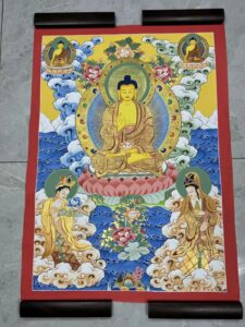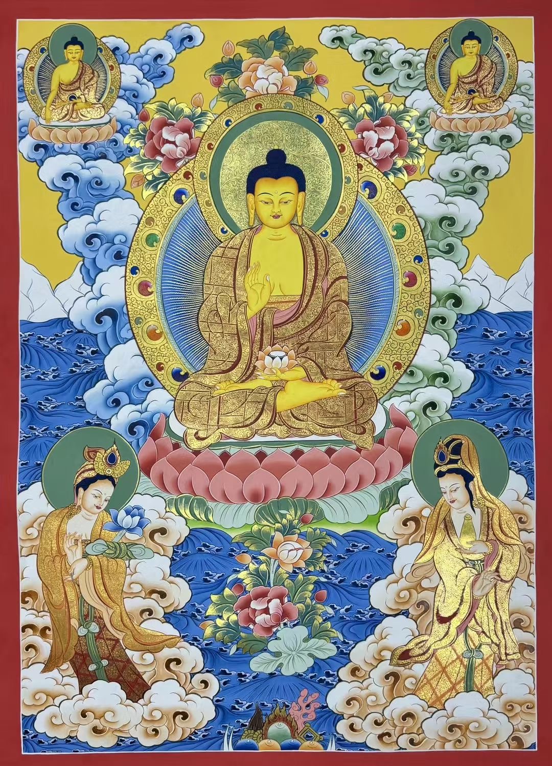 This exquisite Thangka artwork features the Western Three Saints (Amitabha Buddha, Avalokiteshvara, and Mahasthamaprapta), symbolizing infinite light, compassion, and joyful wisdom. A rare collectible created with meticulous handwork and sacred intention.